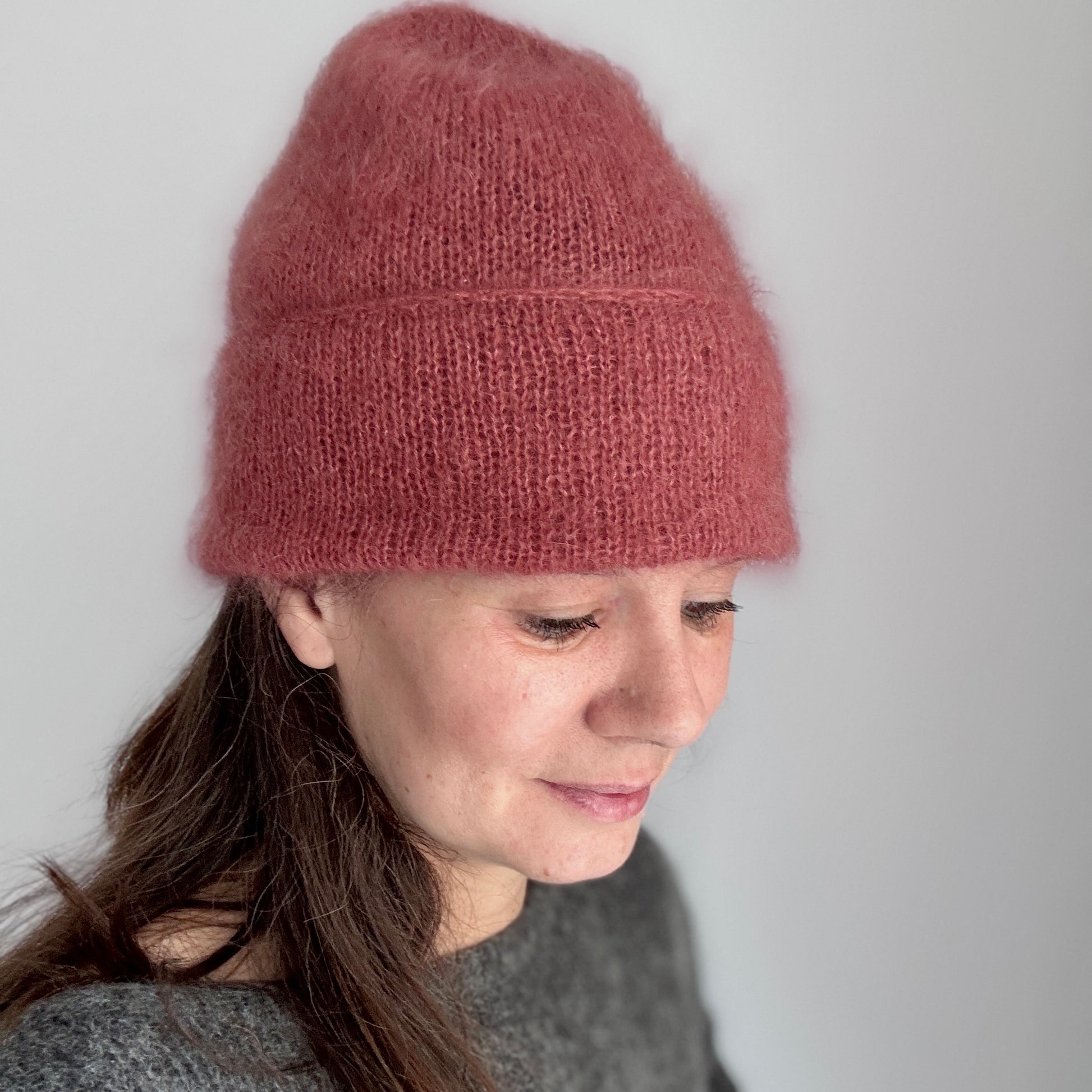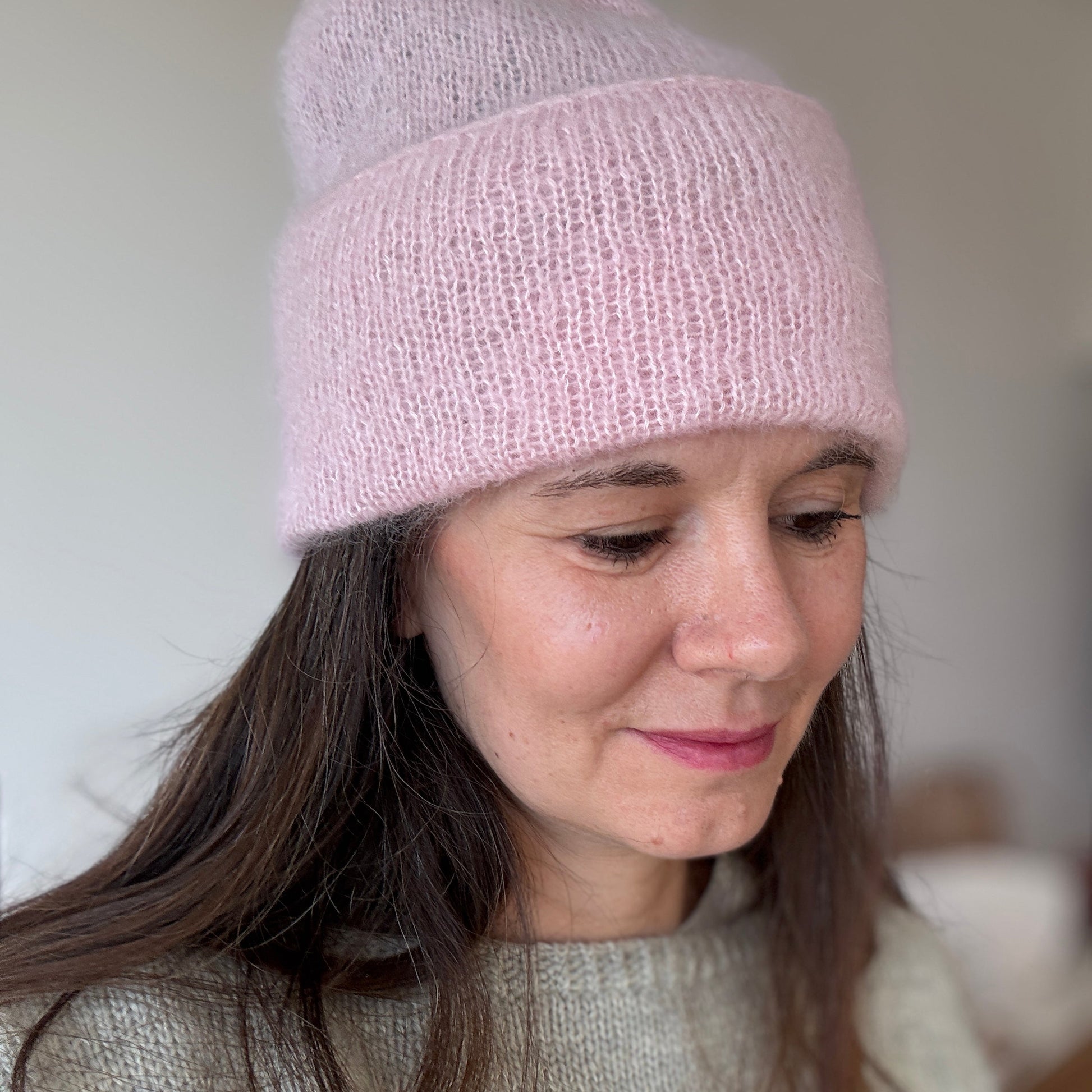 L'aspect aérien du mohair apporte beaucoup de douceur et de féminité à ce bonnet. La bordure est d'abord tricotée en jersey, puis on continue le corps du bonnet dans le même point. Les diminutions sont ensuite réalisées progressivement pour former le haut arrondi du bonnet.